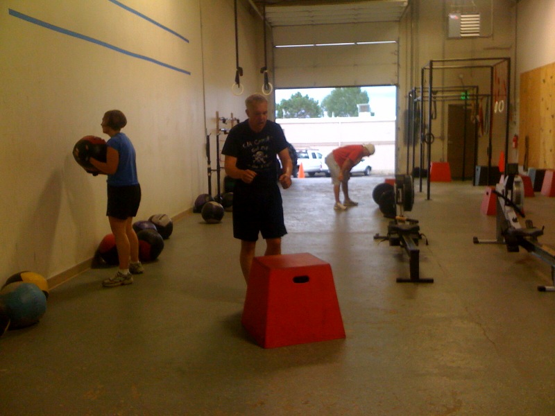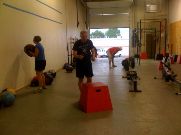 There were three people in my first class, and we decided to start everyone at a different station. Sarah started with the Wall Balls, Brandon at the Sumo Deadlift High-Pull, and David at the Box Jumps. It was great to have Brandon back with us, too!