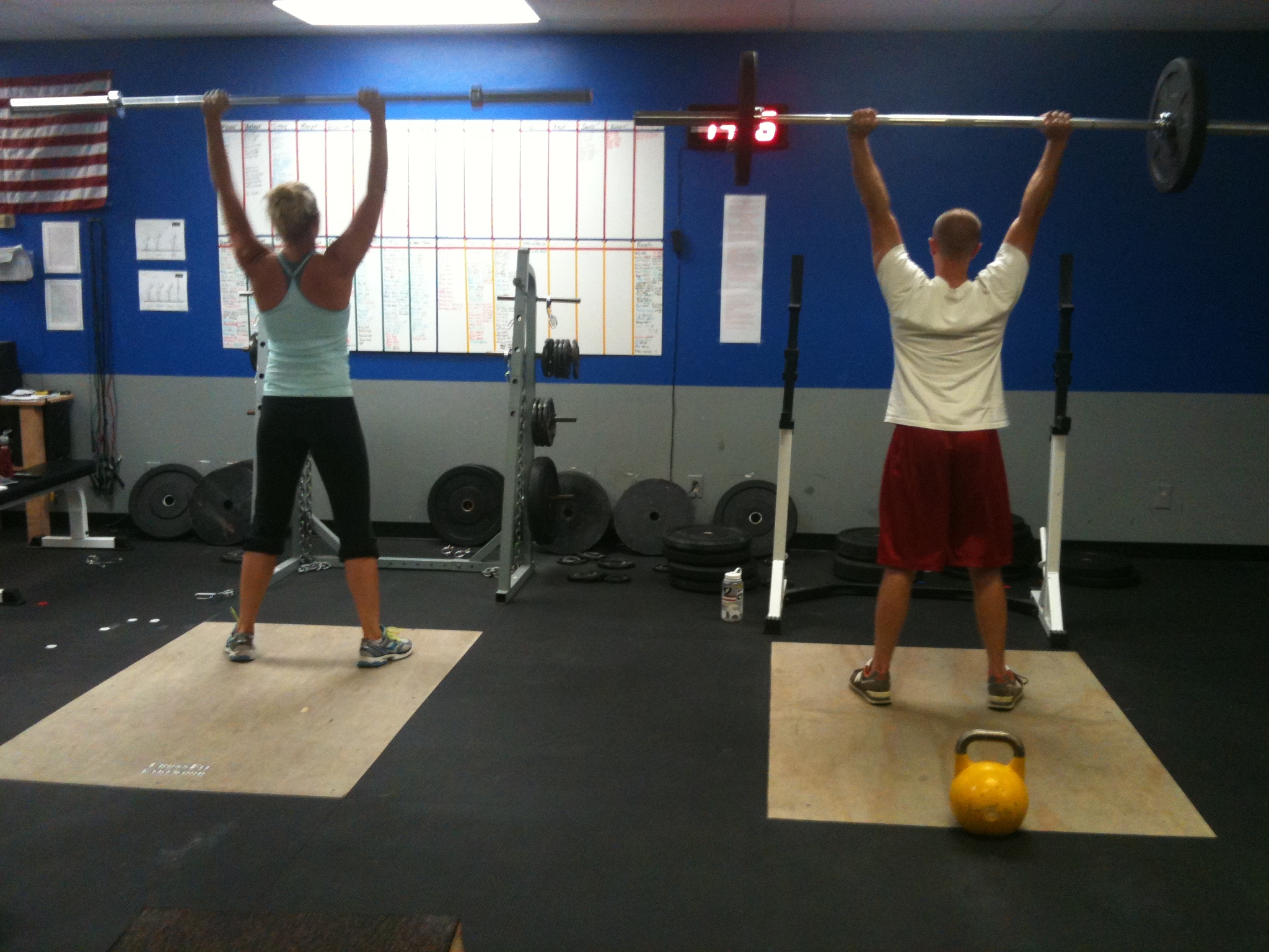 Kristin (35# Bar / 12kg Kettlebell) – 7 rounds + 10 Push Press + 10 Swings + 5 Box Jumps