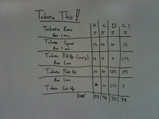 Since there was so many parts of the workout to keep track of, I will simply post an image of the results on the page. The numbers listed per person represent the fewest number of reps they had for each exercise.