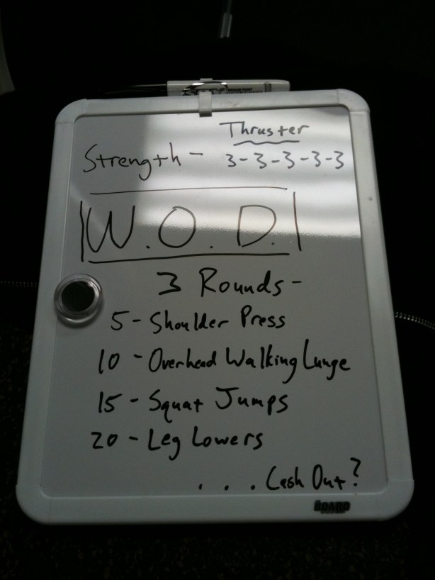 The “Strength” portion of the workout was going so well, I actually decided to spend more time working on form and technique on the Thrusters, that I shortened the main WOD from 5 rounds to 3 rounds. No regrets, though… the Thrusters looked good!