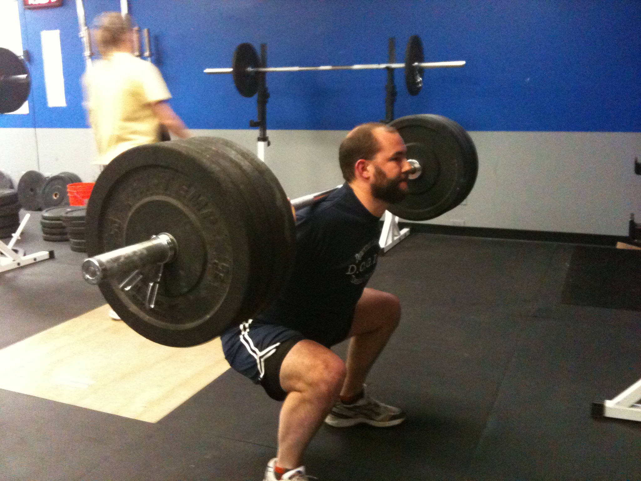 The strength portion would consist of Back Squats, working up to three sets, and it seemed like almost everyone PR’d! Generally if we’re doing 5 sets of 3 reps, that final set will be written as “3+”. This means that the goal is to get those three reps, but IF the athlete can do more reps, they should continue on. Jamie got an awesome 6 full reps on his final set! You can see by the picture below that his range of motion was awesome even when he started to get tired. Well done, sir.