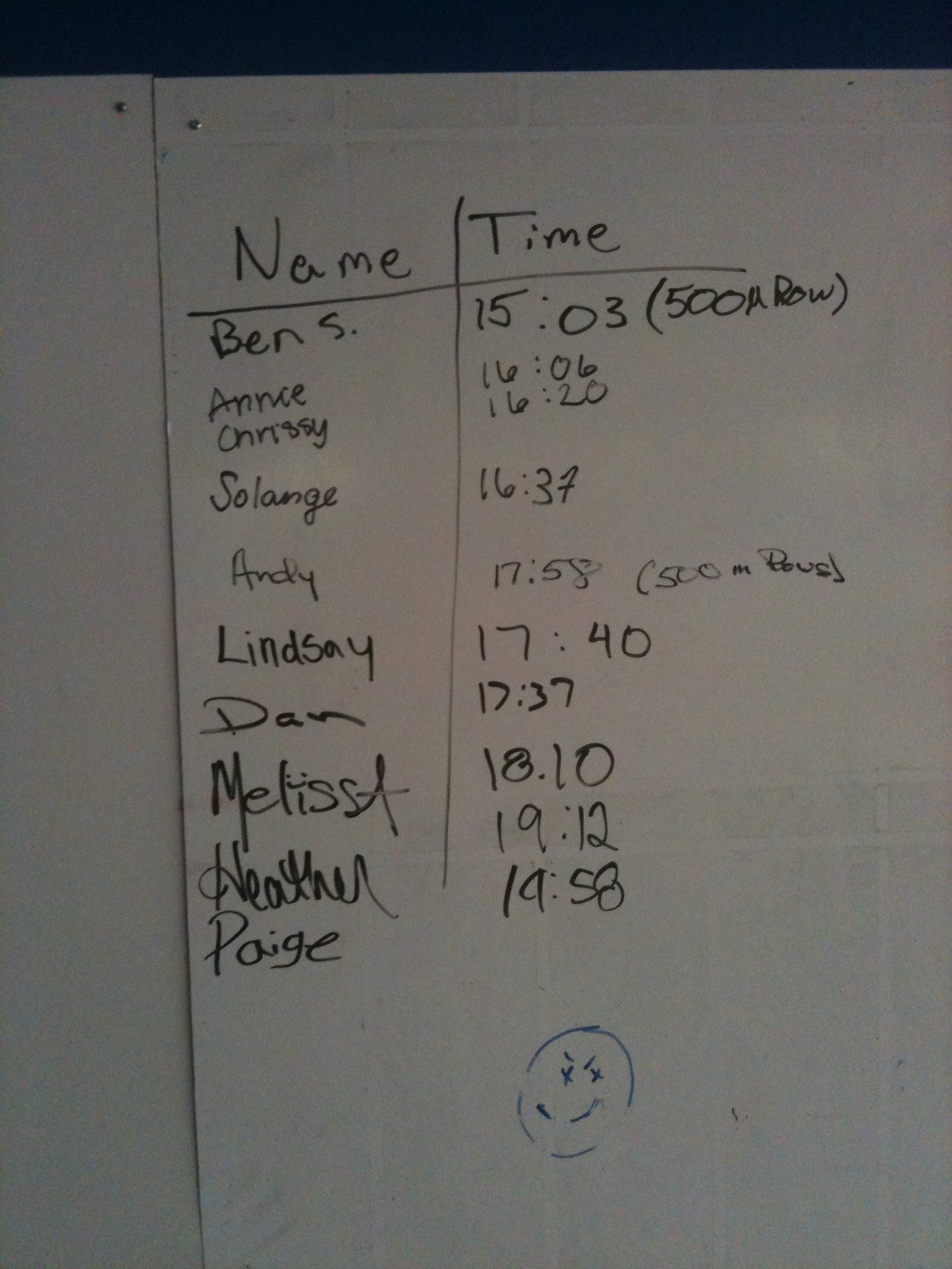 Today, I had to post the Final Results. Why? Because I think it’s hilarious to see how people write when they have just been working out really hard for 20 minutes. I mean, I know you all track your training at home, and wanted to give you times!