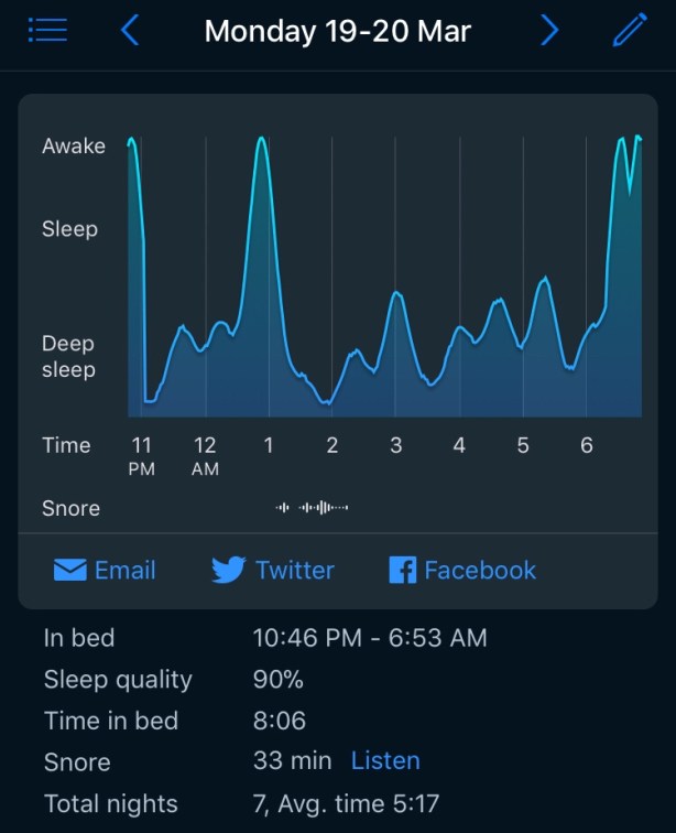 The pic of the week comes from Sleep Cycle app I use (when I remember) to track my sleep. Last week I didn’t have to set an alarm on Tuesday morning, so I slept for eight whole hours Monday night! That’s a big deal for me!